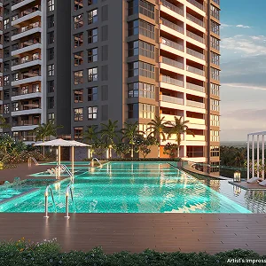 Residents enjoy indoor and outdoor facilities of KNS Aura including a clubhouse, pool, play zones and landscaped social spaces